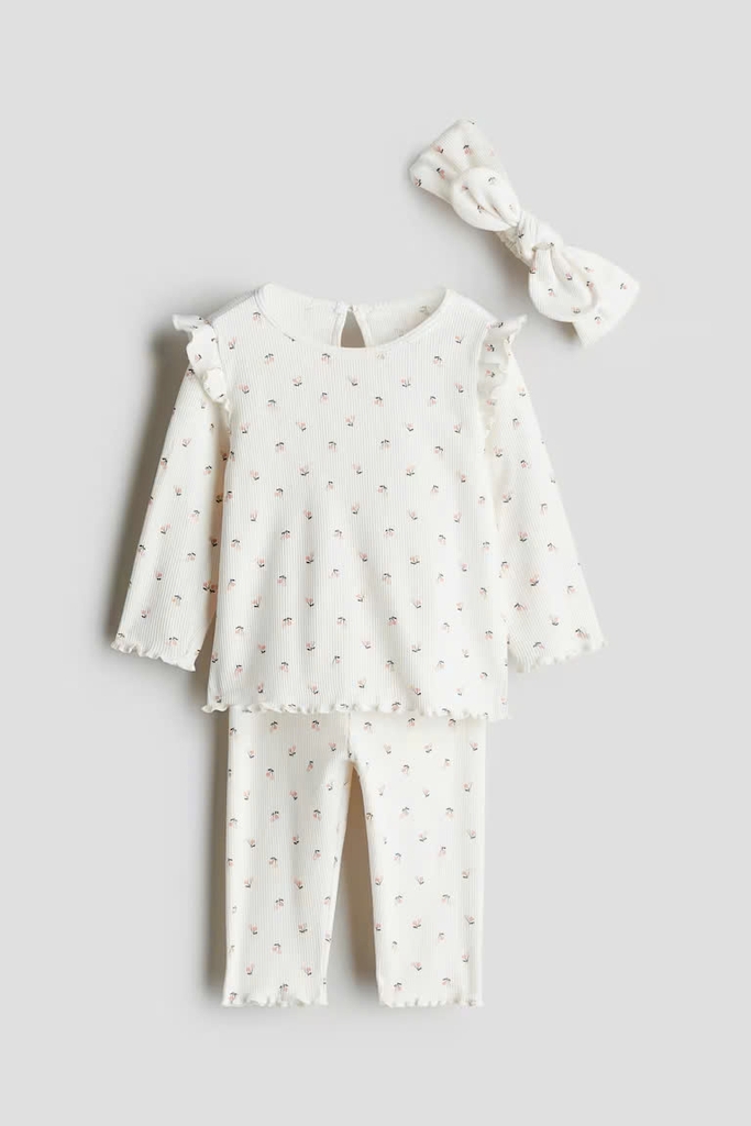 Set bộ dài tay kèm turban trắng / hoa nhí